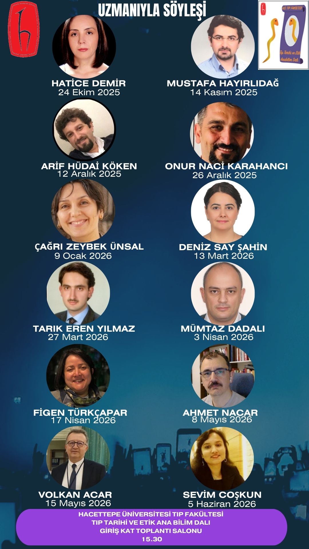 HacettepeÜniversitesi Tıp Fakültesi Tıp Tarihi ve Etik Ana Bilim Dalı tarafından, Tıp Tarihi ve Etik Ana Bilim Dalı doktora programı mezunlarının tez konularını paylaştıkları 2025-2026 yılıUzmanıyla Söyleşi etkinliğinin birincisi 24 Ekim 2025 Cuma günü saat 15.30’da Sıhhiye Yerleşkesi Tıp Fakültesi Tıp Dekanlık A2 toplantı salonunda gerçekleştirilmiştir.